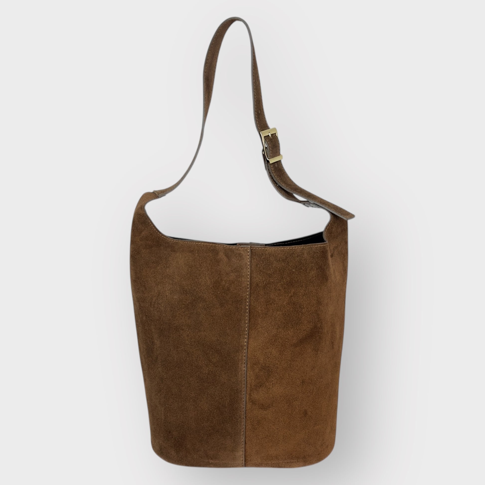 La texture soffice del camoscio autentico offre una sensazione di lusso accessibile, mentre il design minimal e moderno rende il secchiello facile da abbinare a qualsiasi outfit. La tracolla regolabile, gli accessori metallici dorati e la pochette interna aggiungono praticità e dettagli premium, rendendolo ideale per chi cerca una borsa capiente, morbida e di alta qualità.